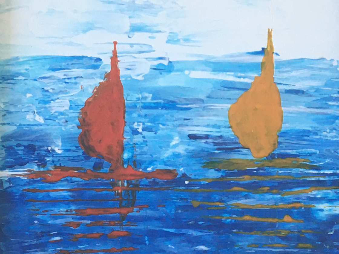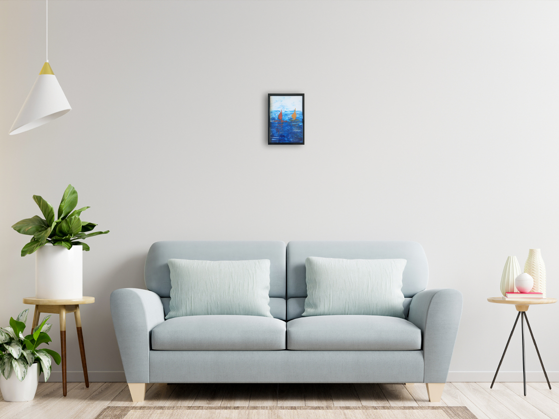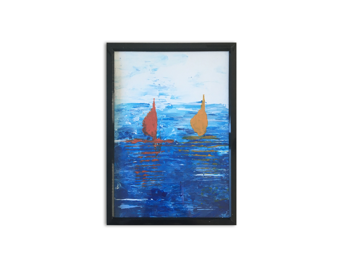 Abstract painting of sailboats on acrylic paper, finisched with a matte varnish in a black small frame.