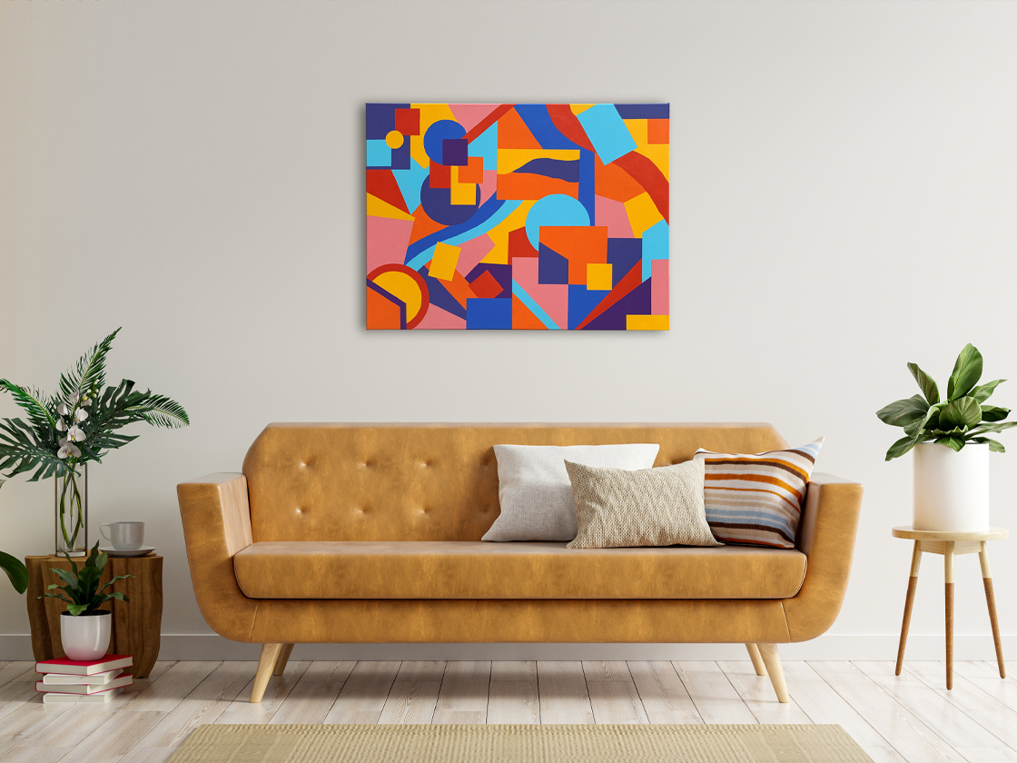 Colorful and geometric acrylic painting on a canvas , finished with a satin varnish.