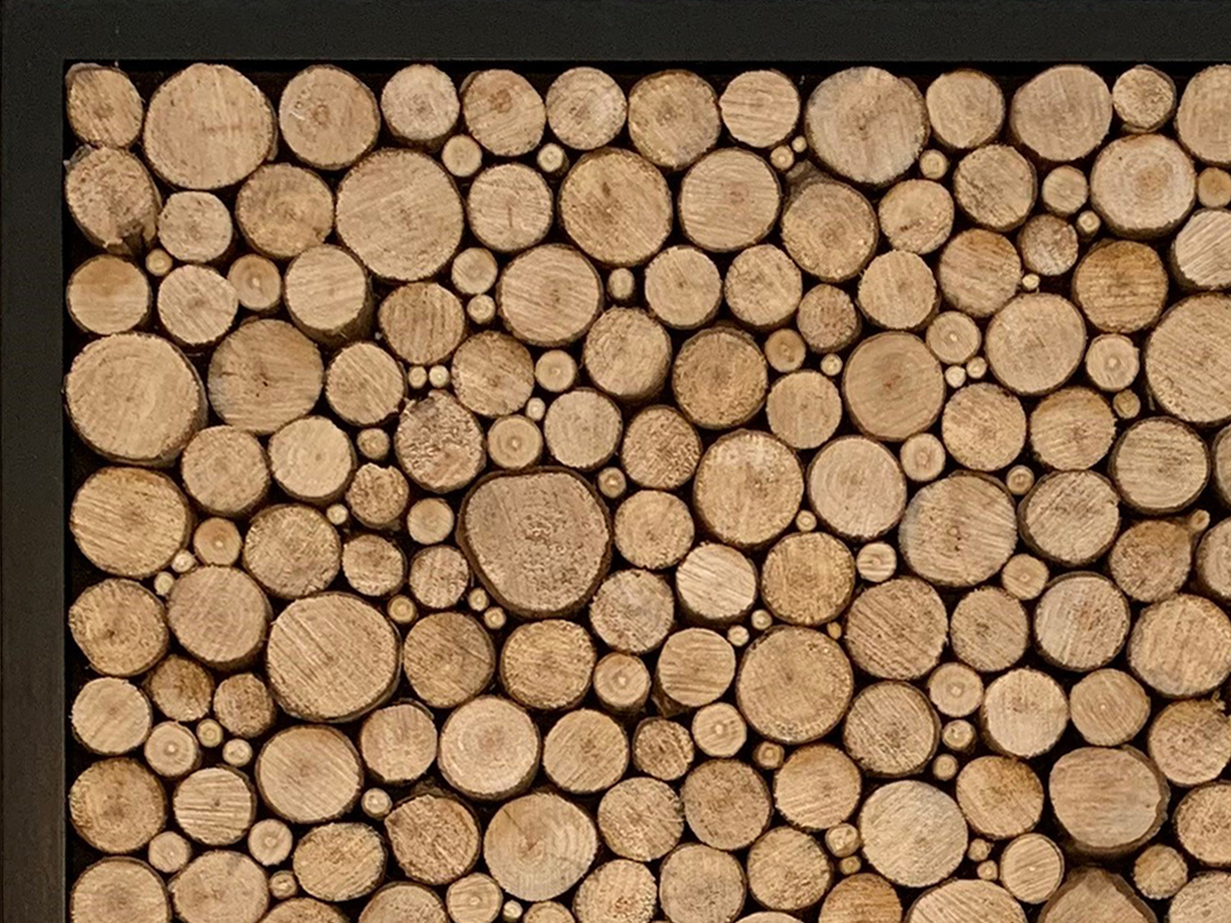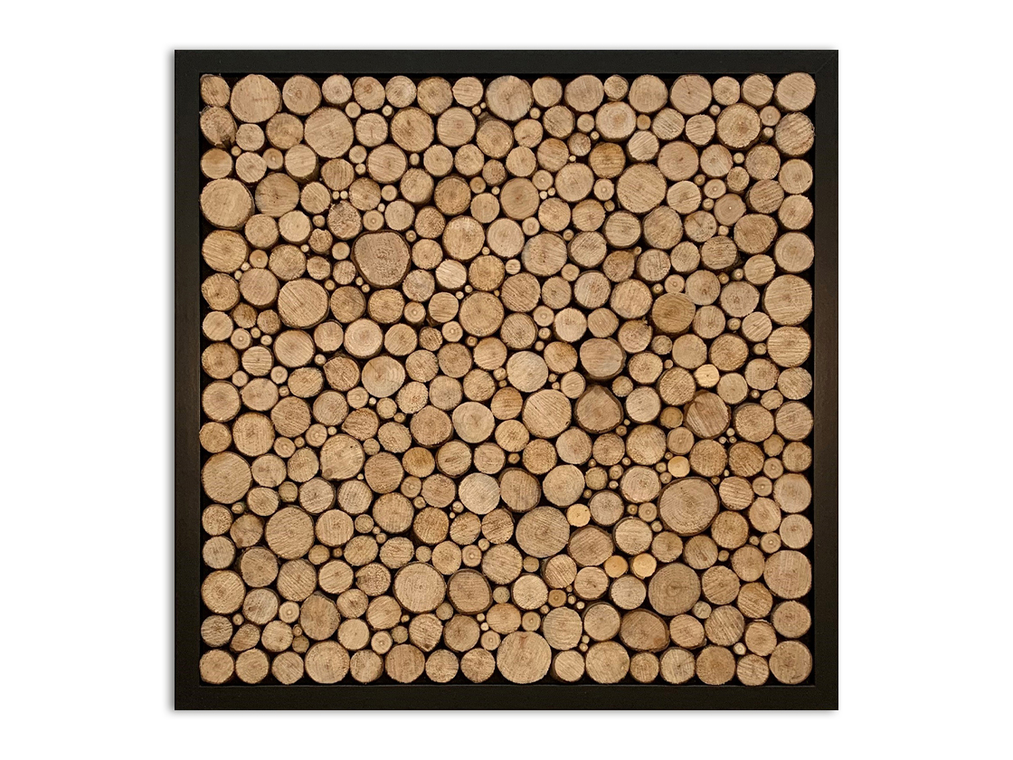 Small and large logs in a frame on a square black painted back panel.